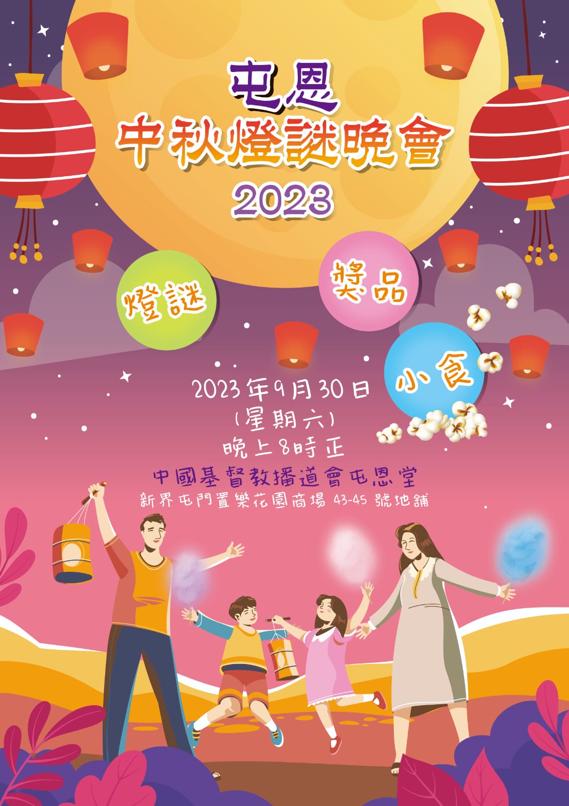 屯恩堂誠意邀請您參加中秋節翌日所舉行的「屯恩中秋燈謎晚會」!2023 年 9 月 30 日 (星期六) 晚上 8 時正,屯恩堂將會成為大家鬥智之地,一齊猜燈謎、吃小食、賞月贏獎品!我們歡迎各弟兄姊妹邀請親朋好友出席,一同歡度佳節!🌝😉